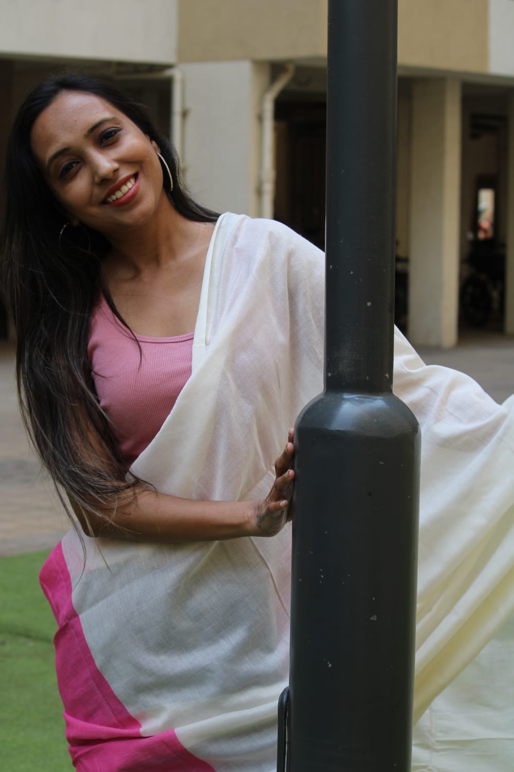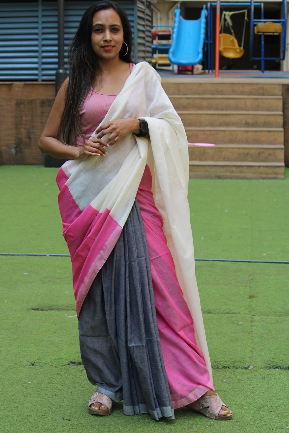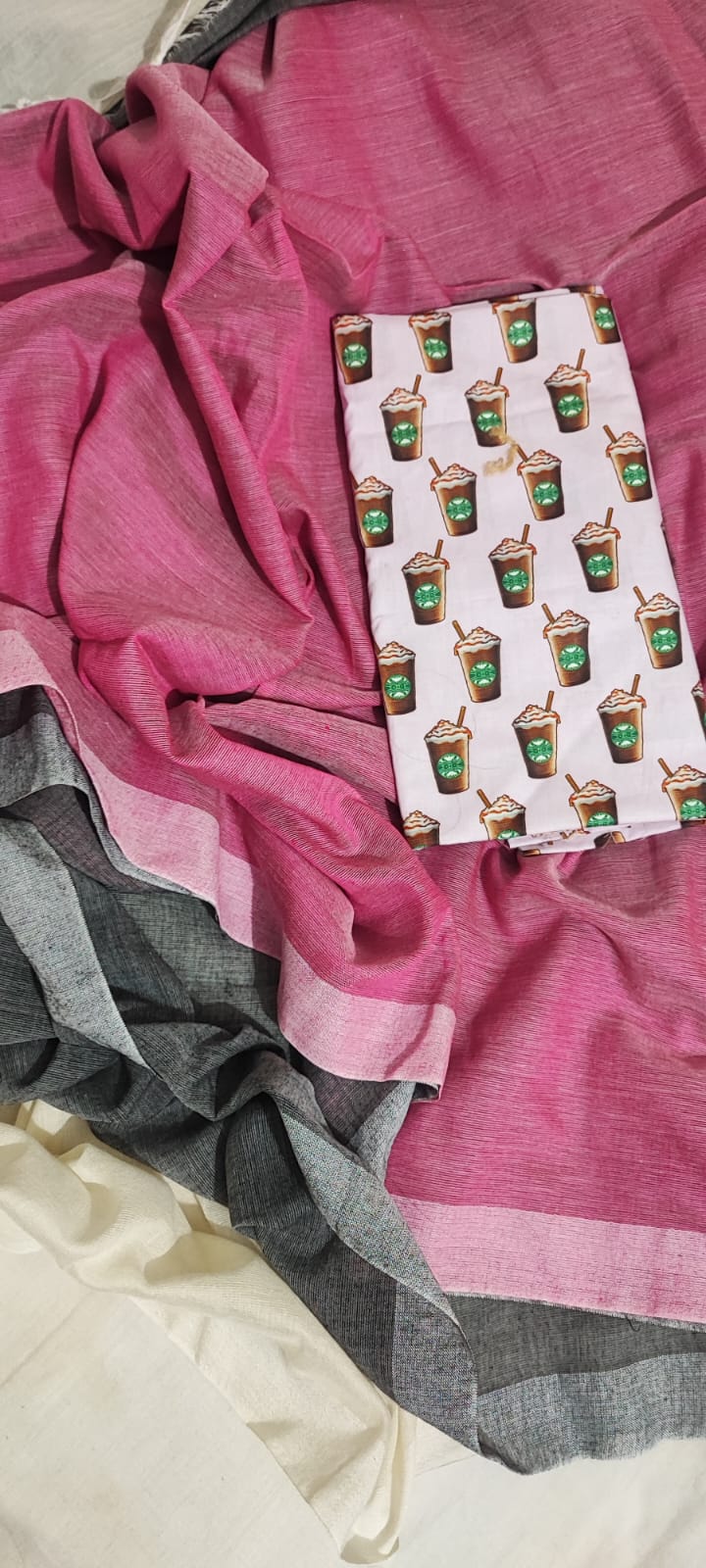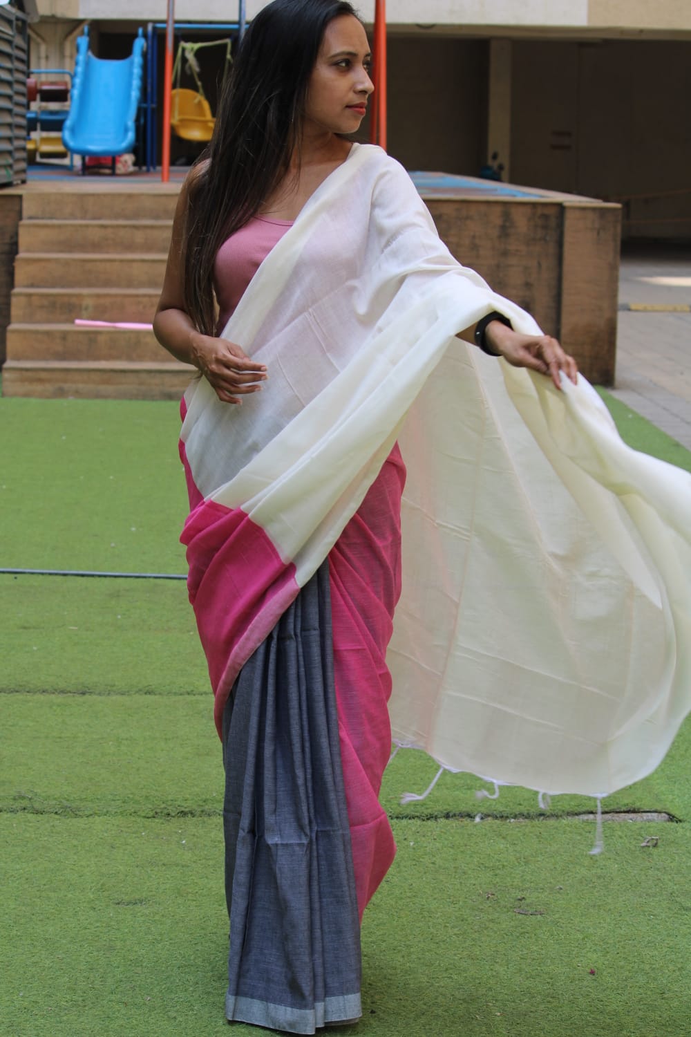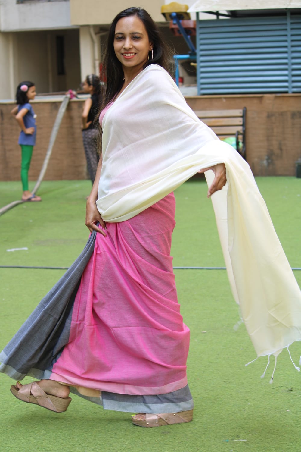 A White, Pink, Grey Cotton Handloom Saree which comes with Additional Blouse Fabric