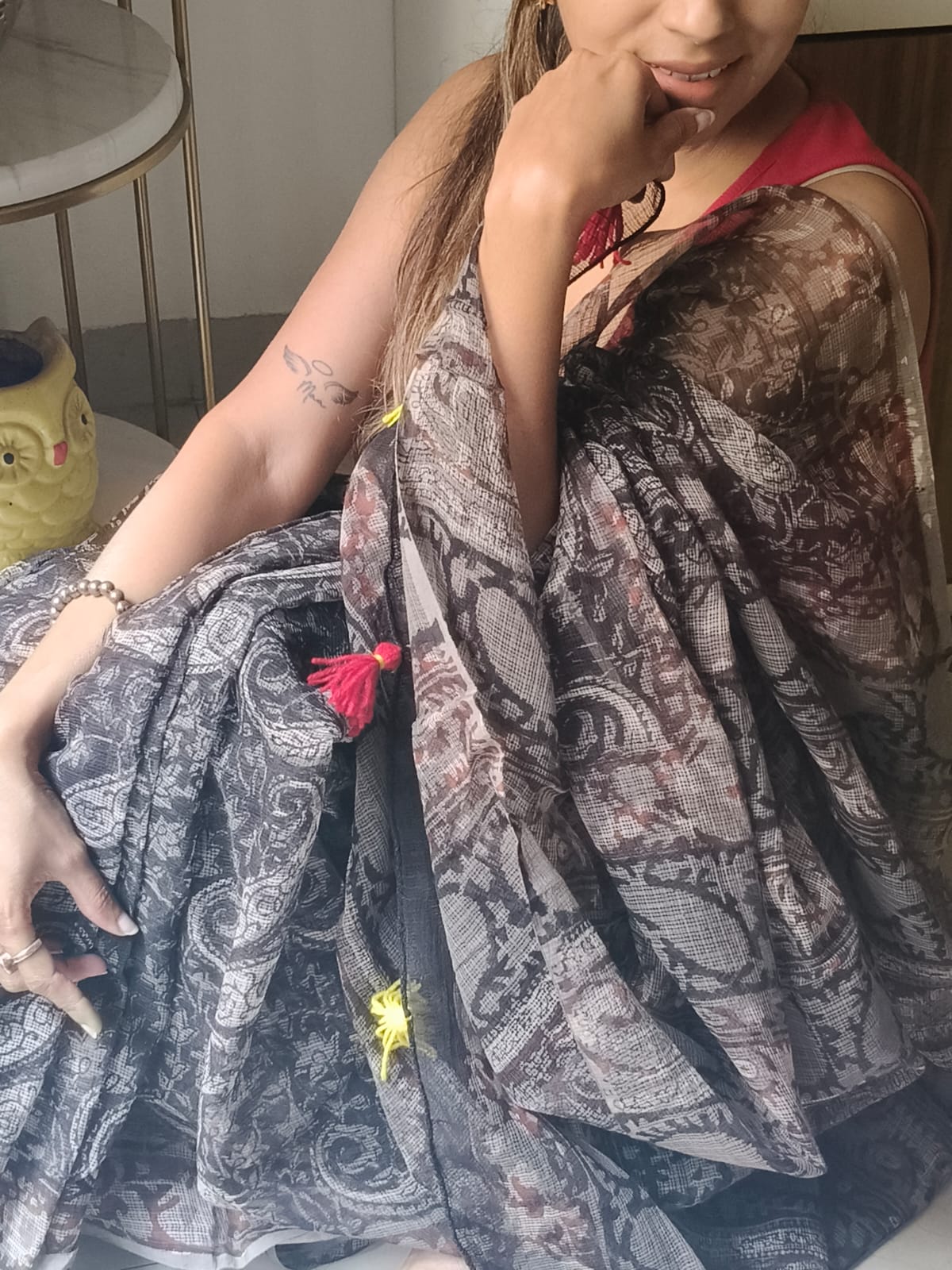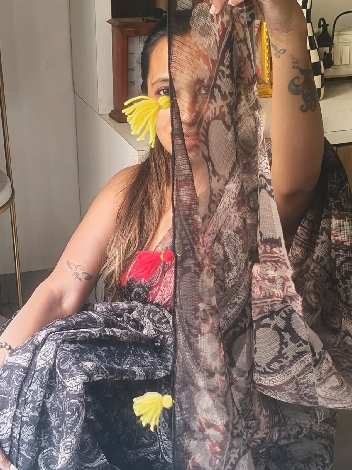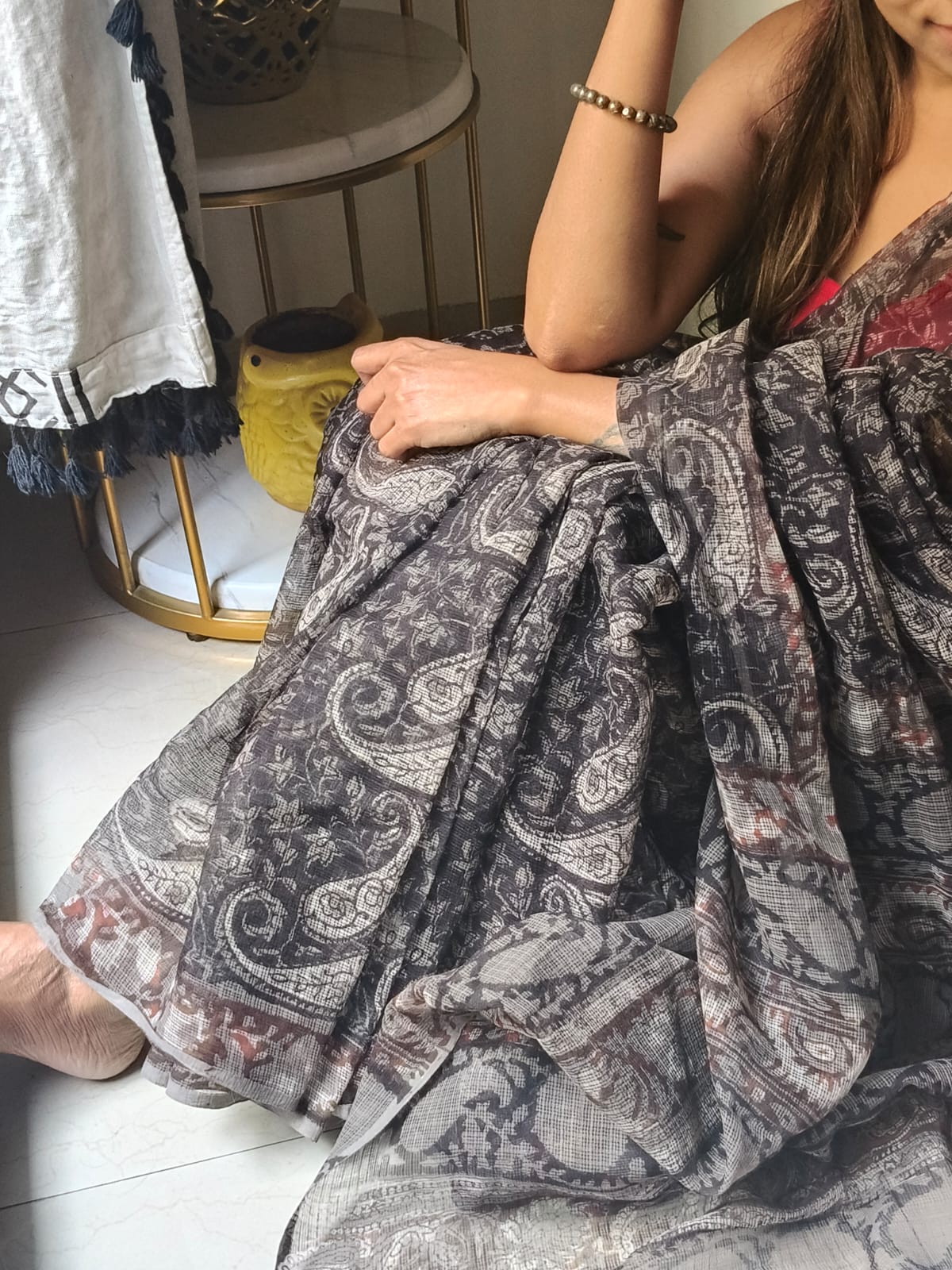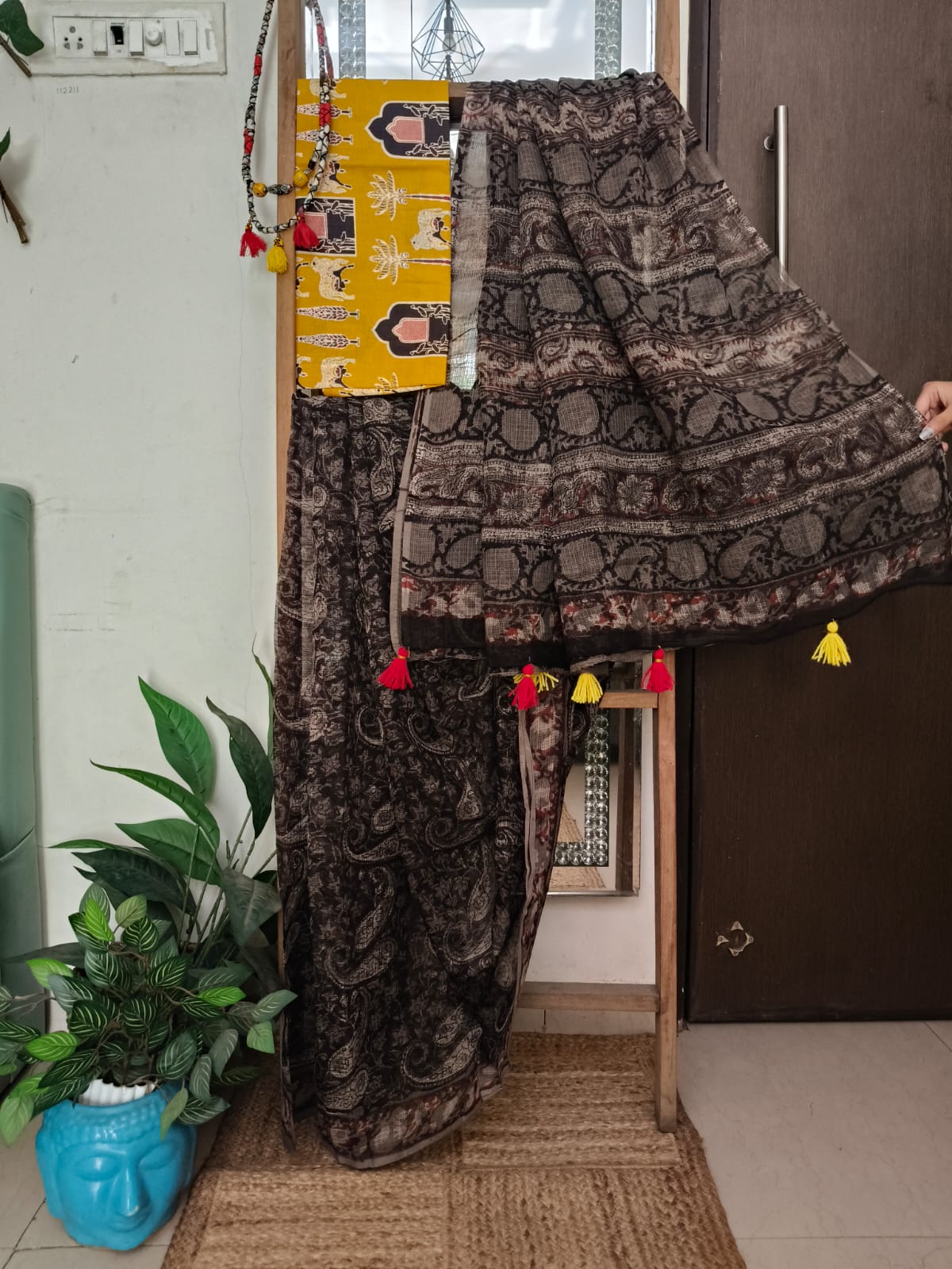 A Black Kalamkari Handblock Printed Kota Doriya Saree. Paired with Additional Blouse Fabric.