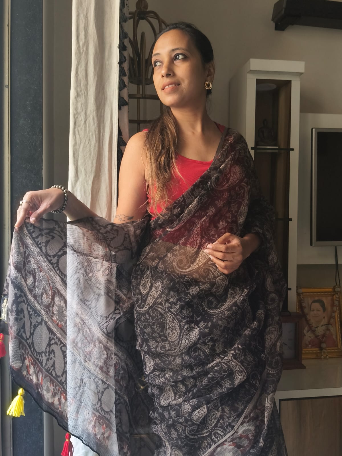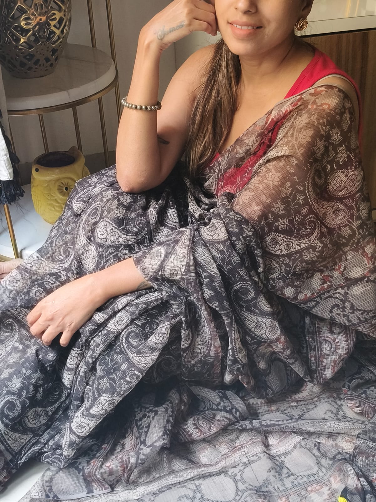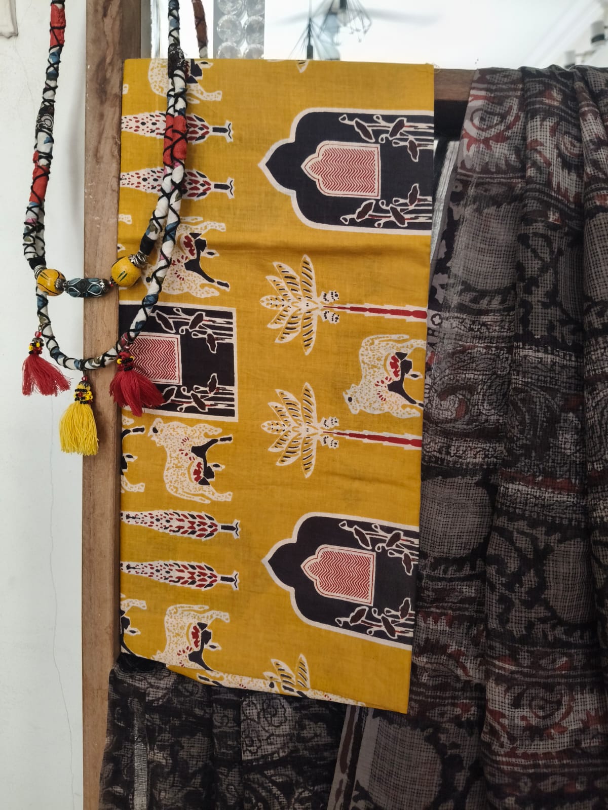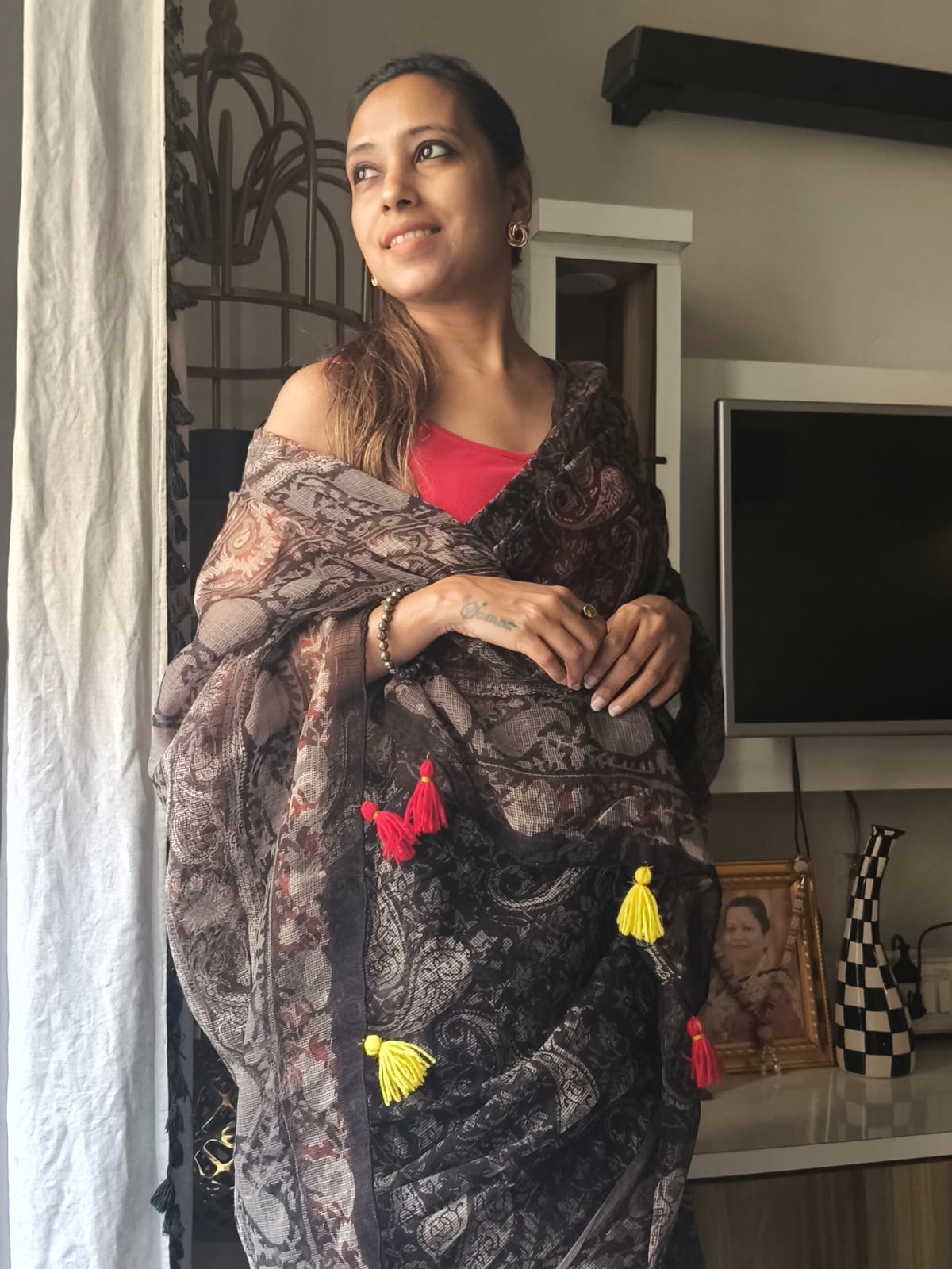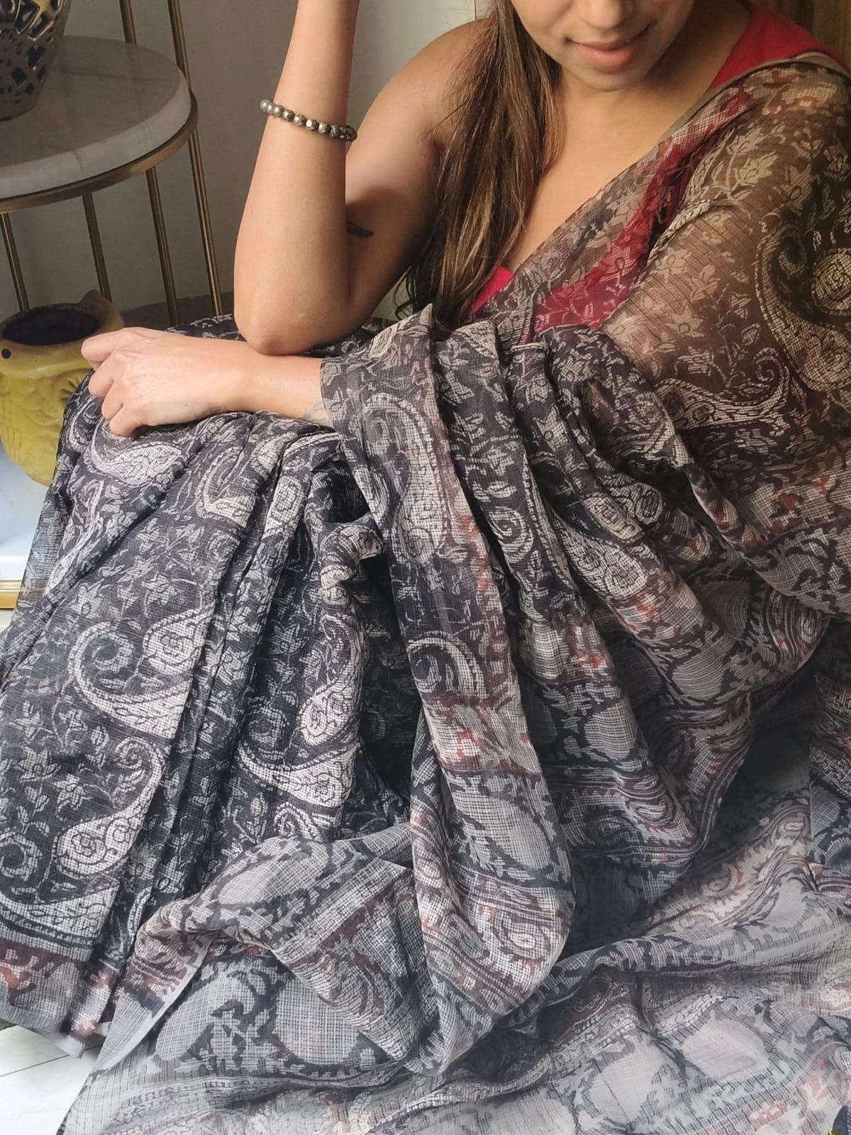 A Black Kalamkari Handblock Printed Kota Doriya Saree. Paired with Additional Blouse Fabric.