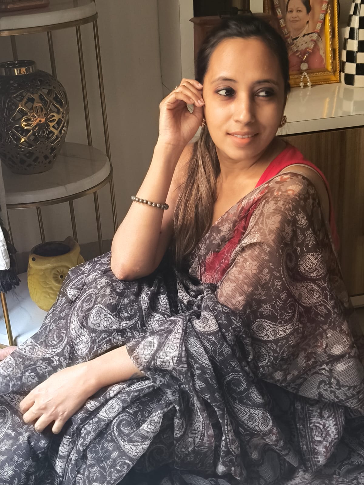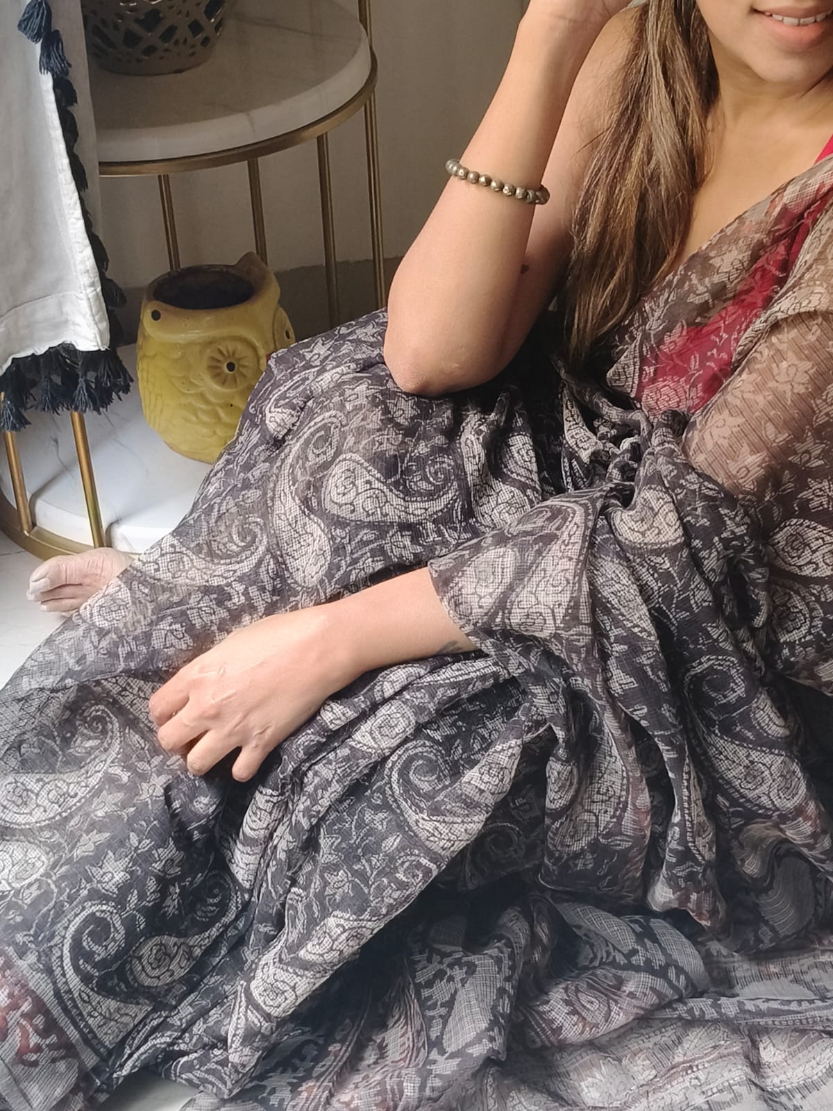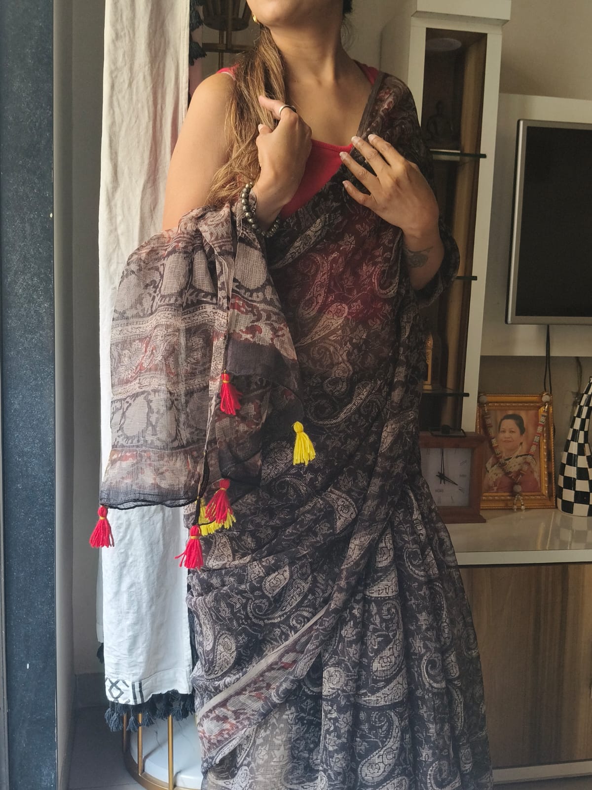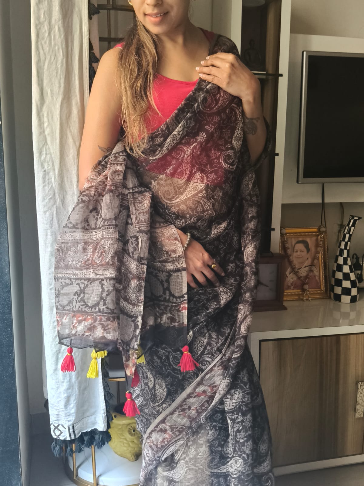 A Black Kalamkari Handblock Printed Kota Doriya Saree. Paired with Additional Blouse Fabric.