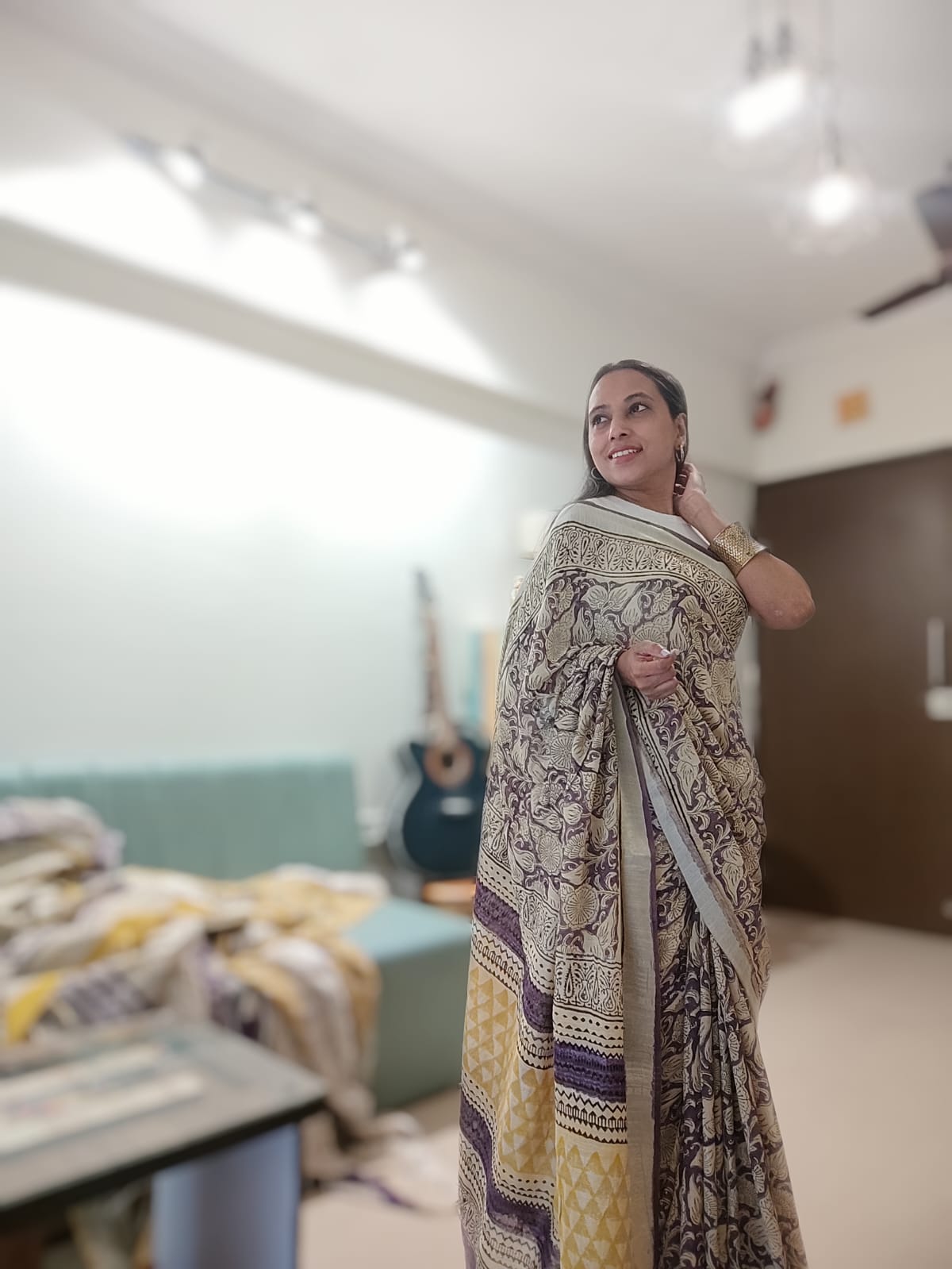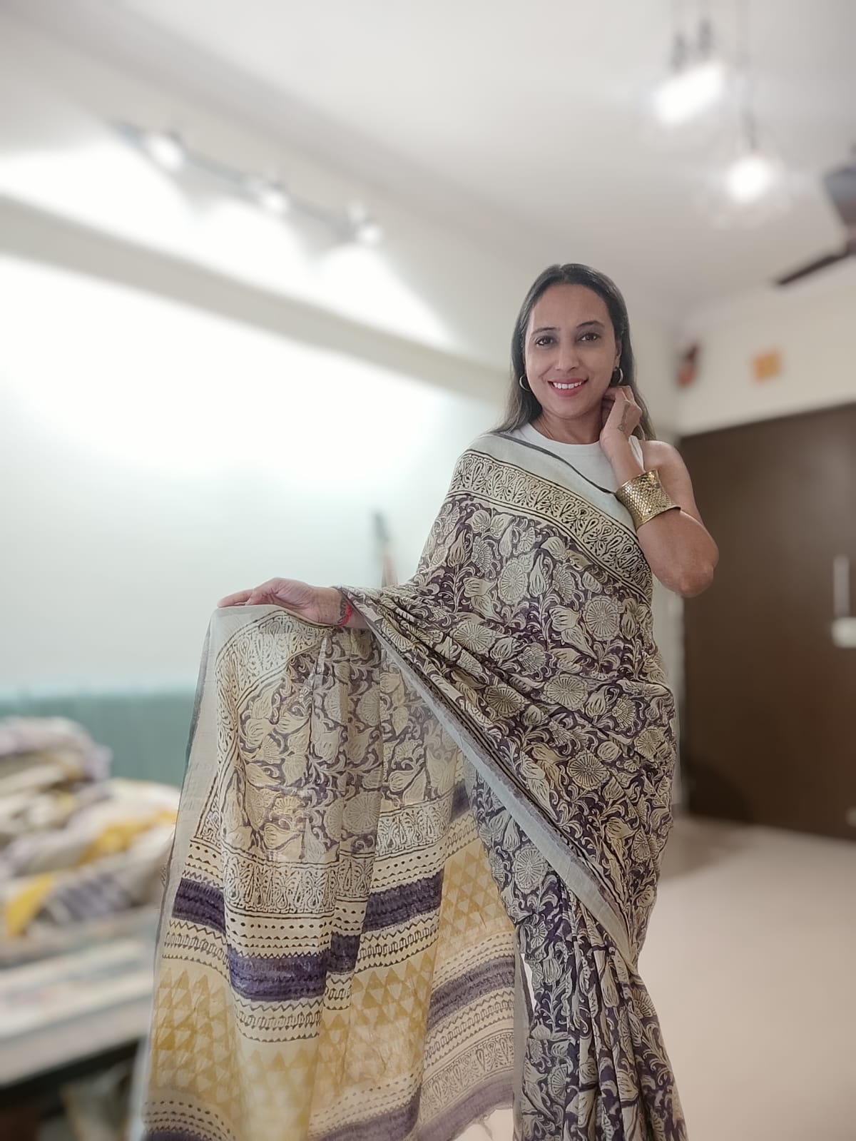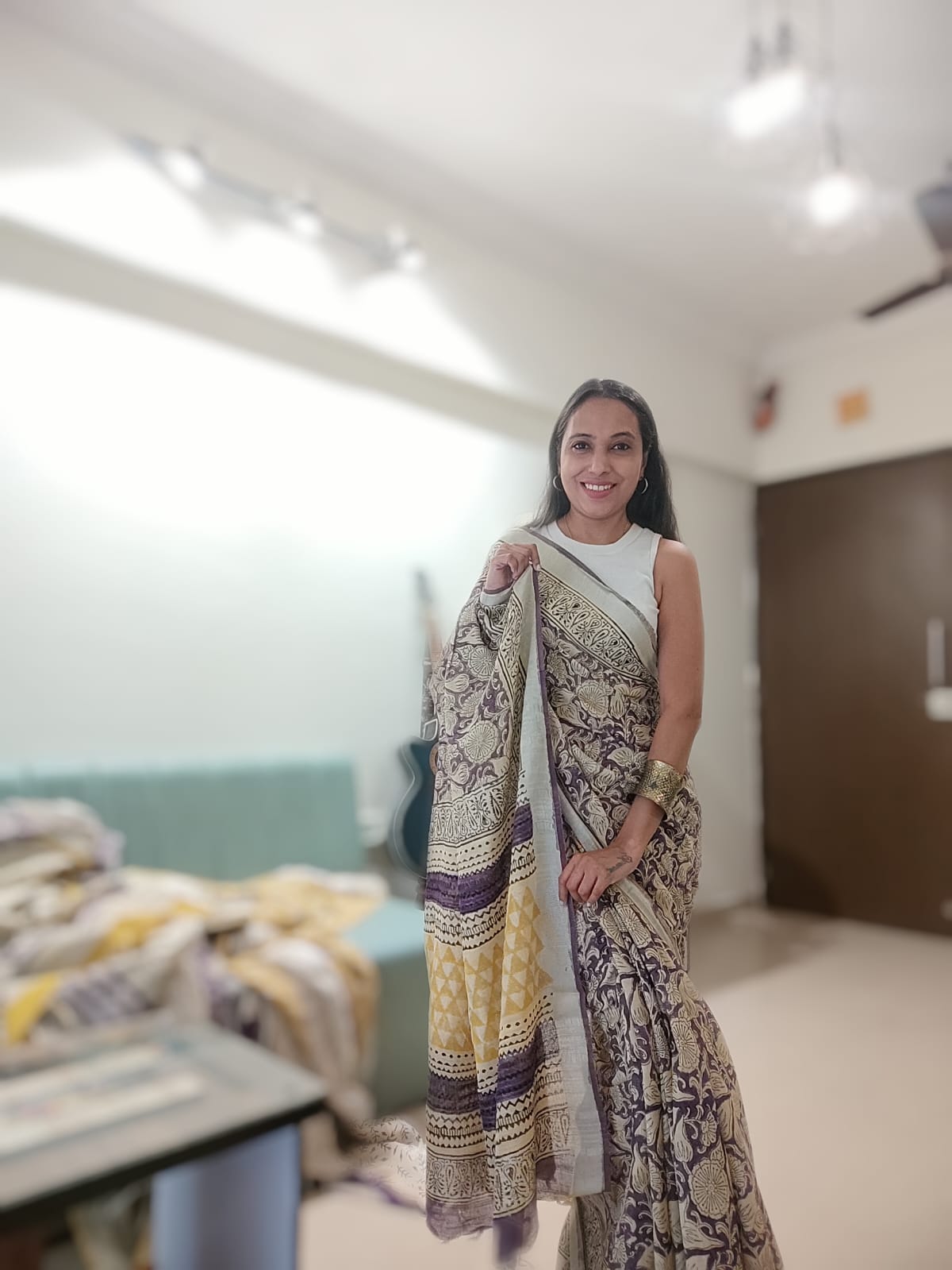 A Leaf Print Linen Saree with yellow crescent.