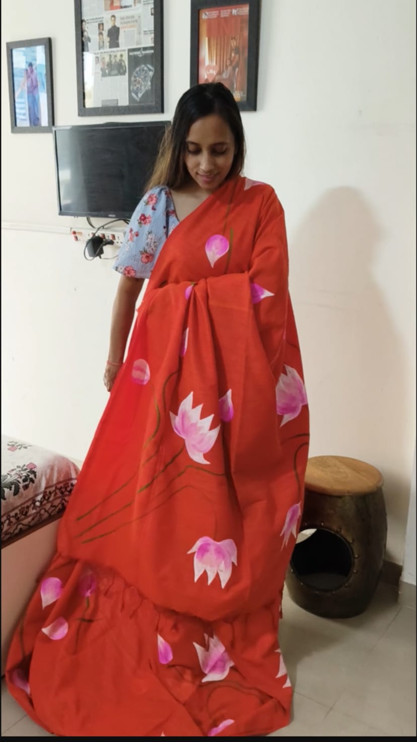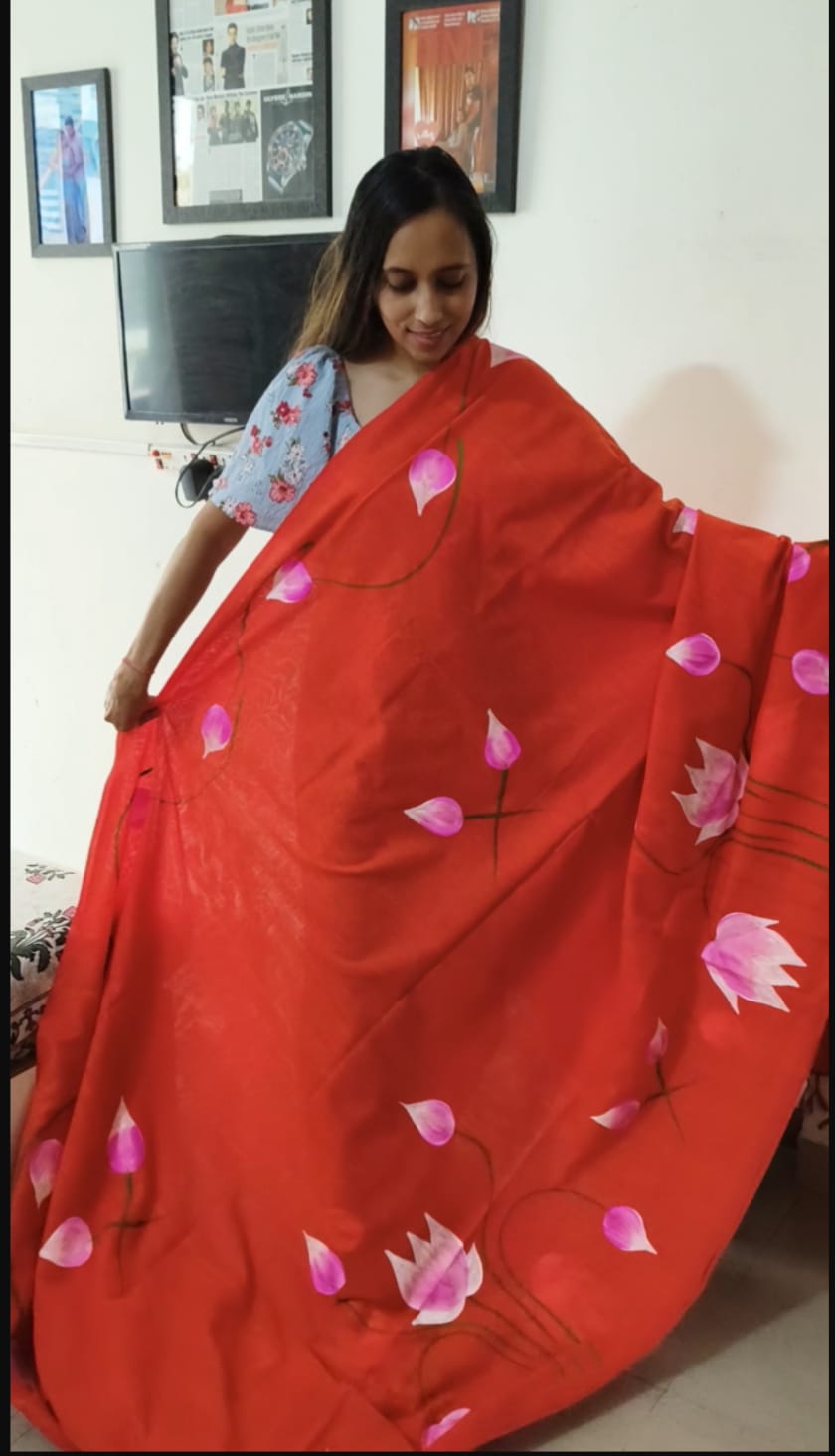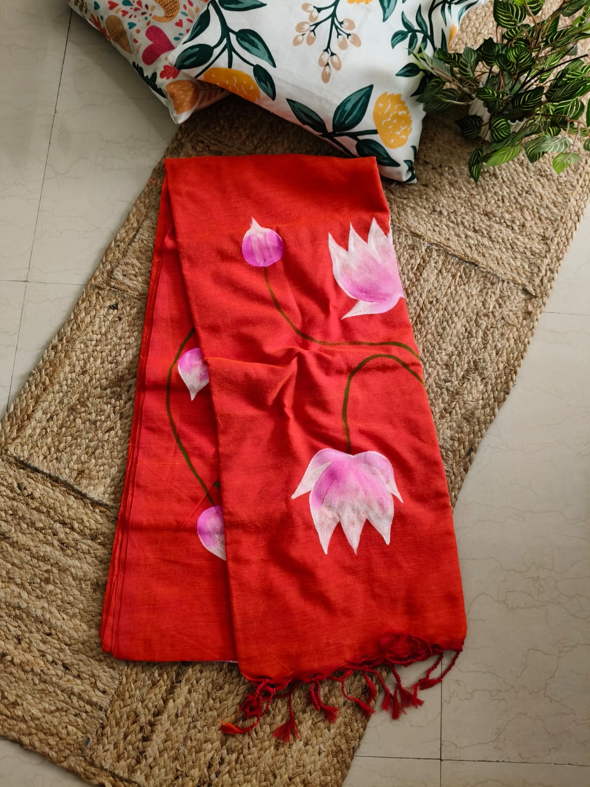 A Orange Tulip Handpainted Mulmul Saree . No Blouse Piece.