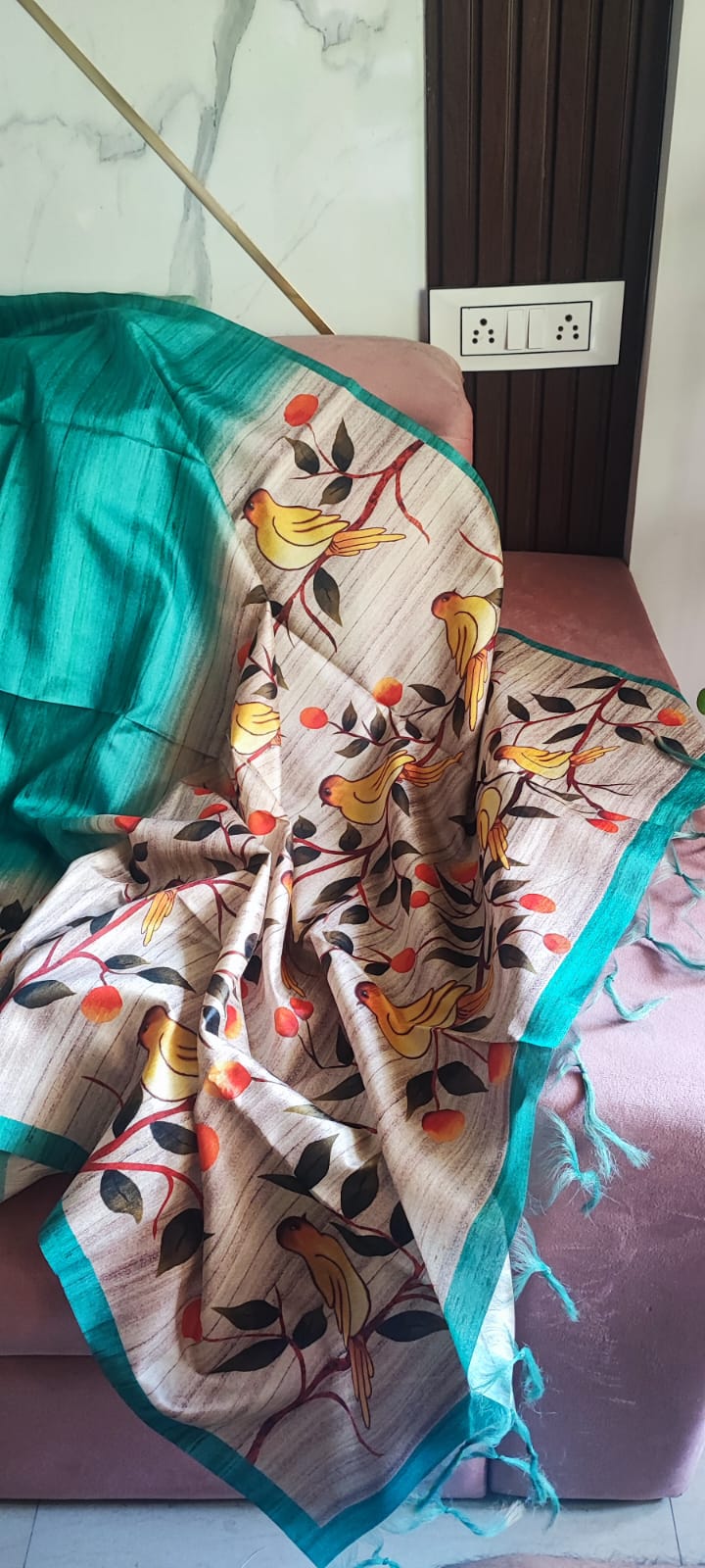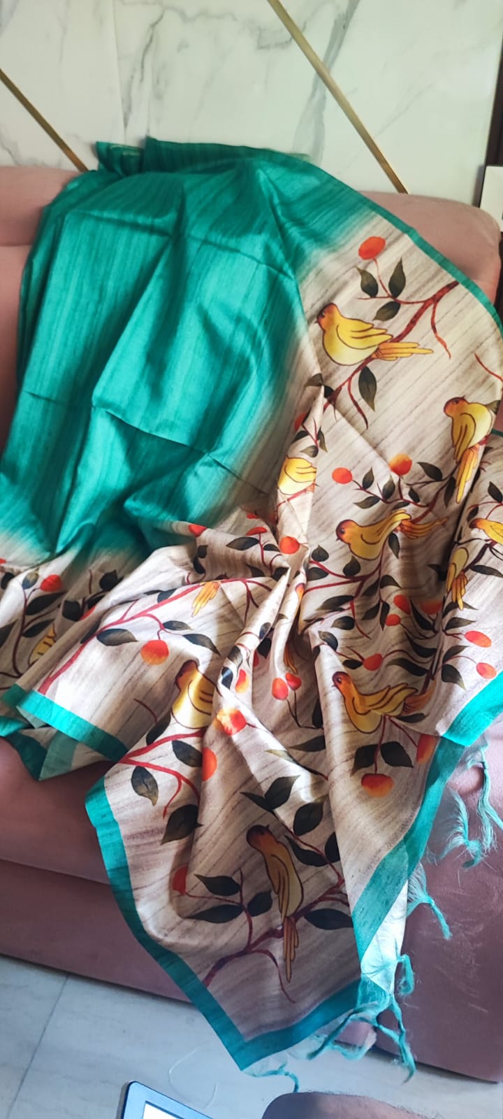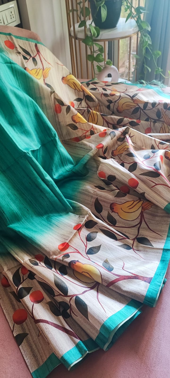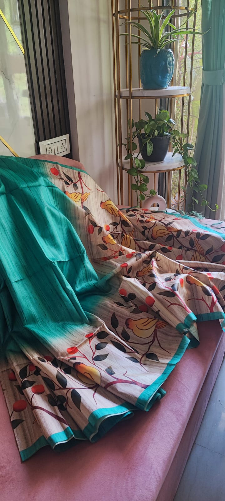A Turquoise Handllom Tussar Gicha Saree with Blouse piece.
