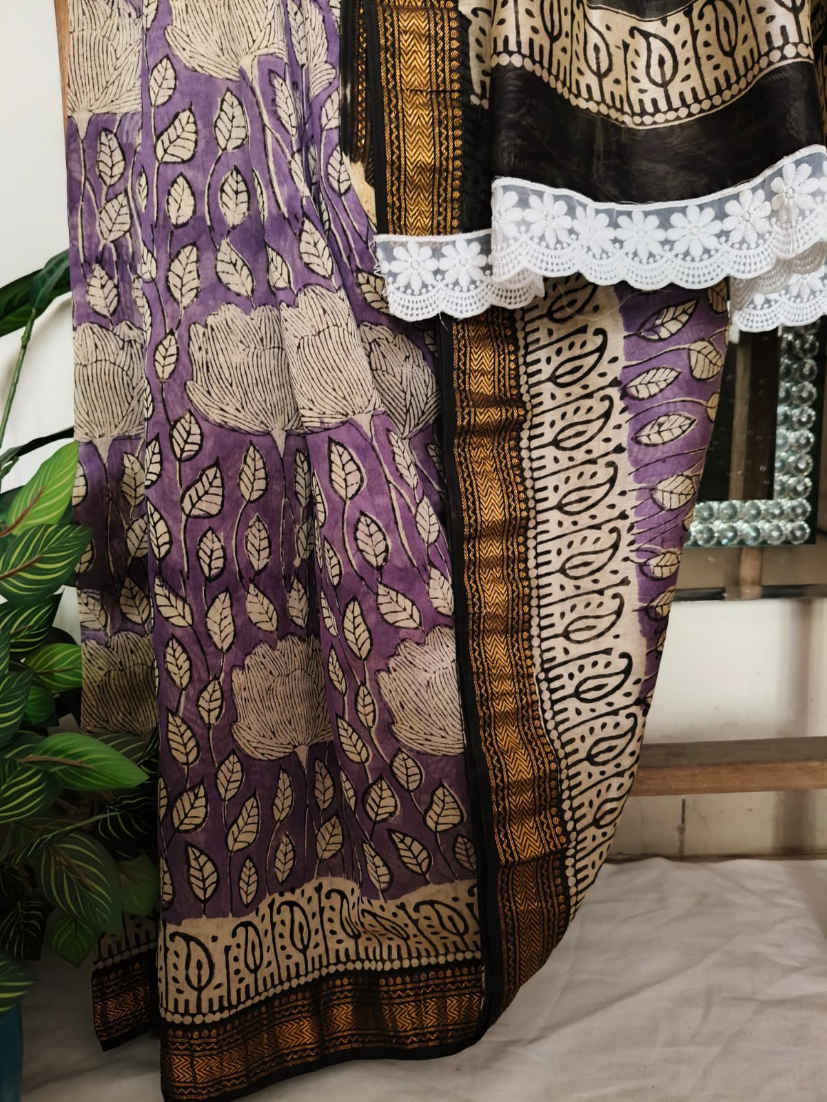 A Lavender Lotus Pichwai Handblock Maheshwari Silk Saree with Additional Blouse Fabric