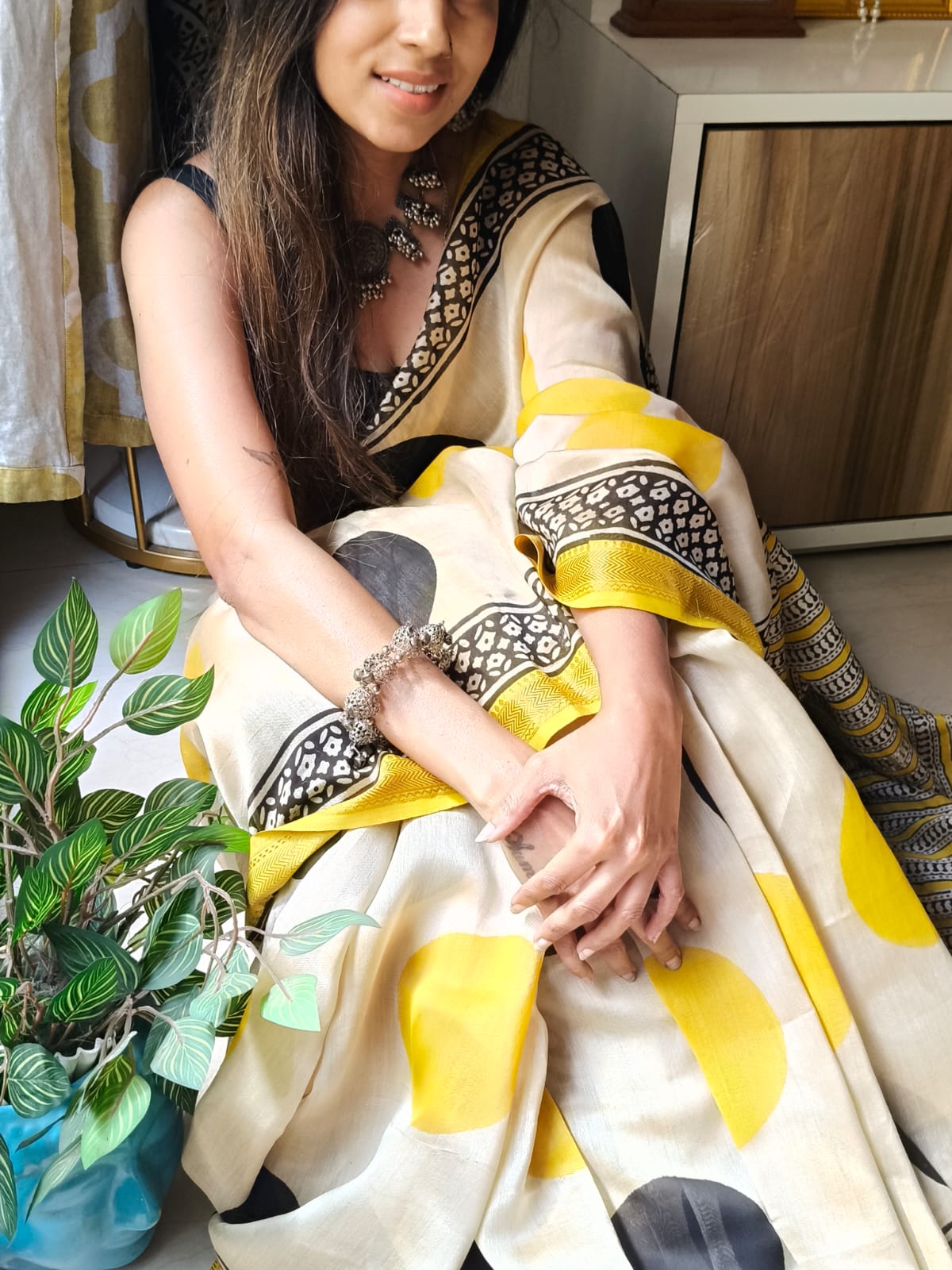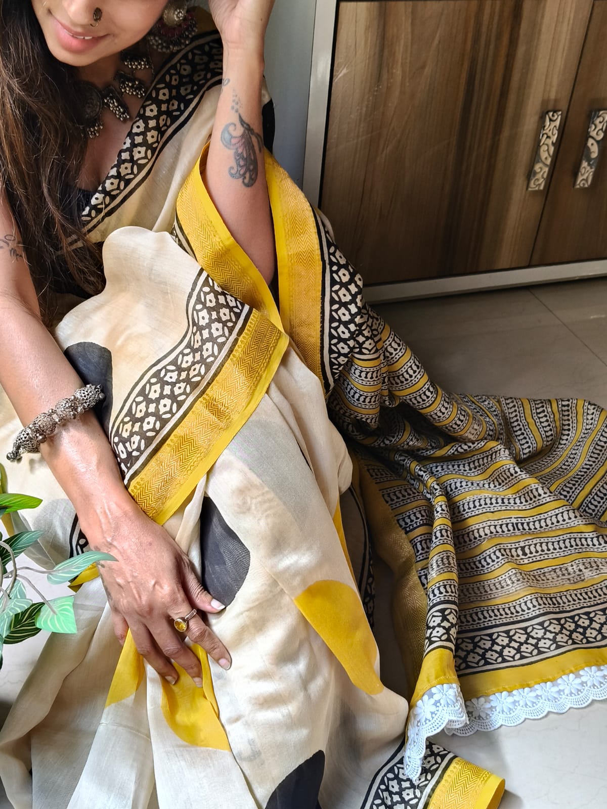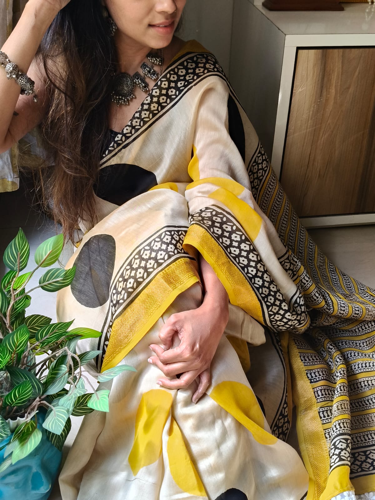An Ajrakh Polka Dot Handblock Maheshwari Silk Saree with Additional Blouse Fabric