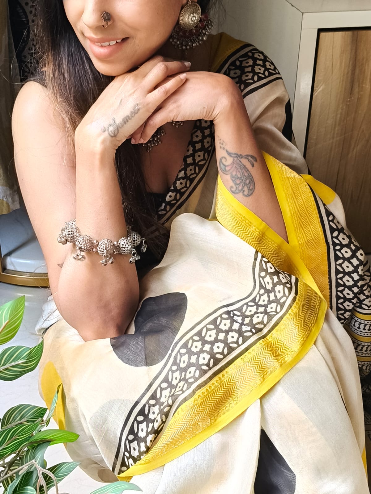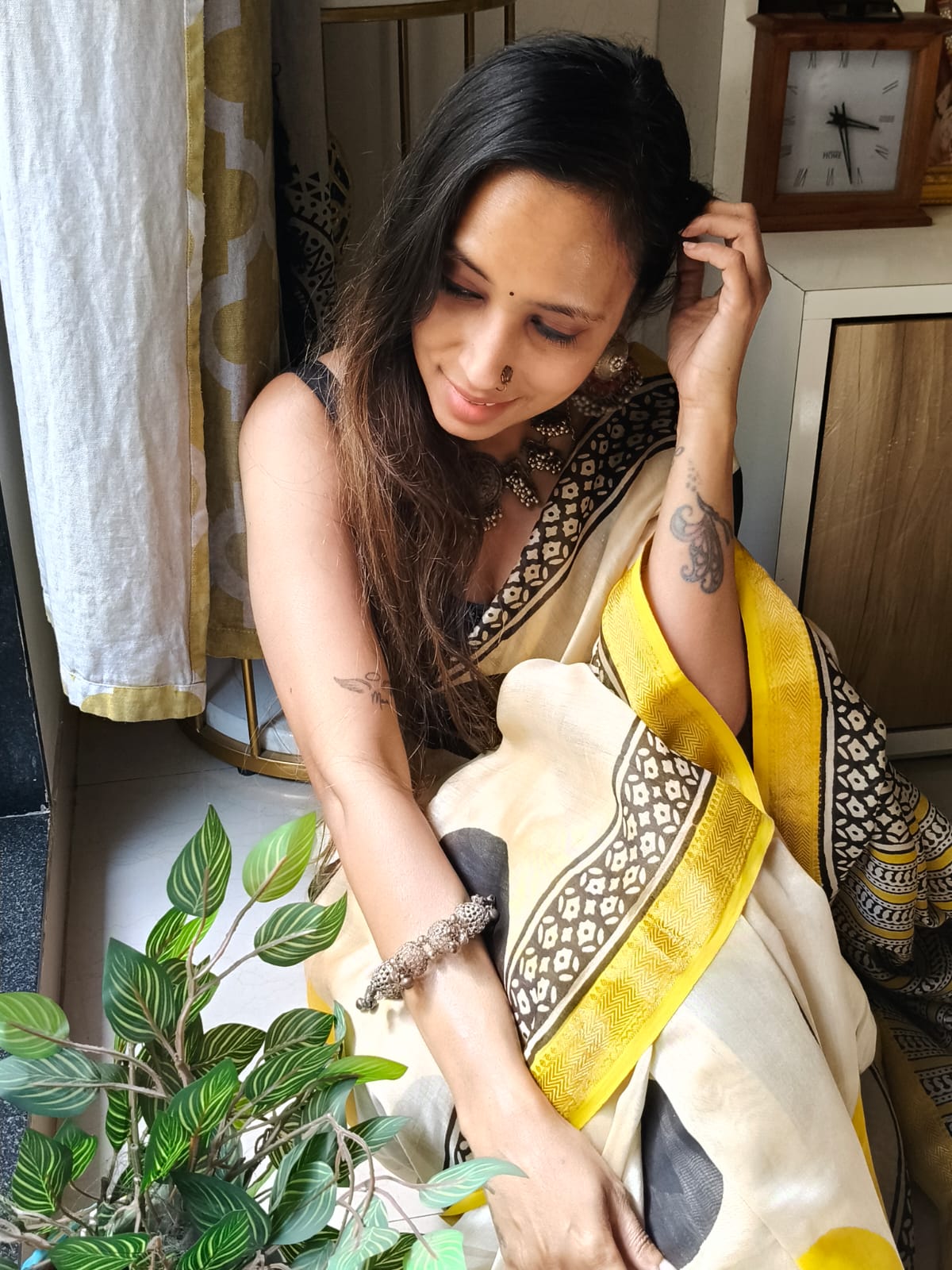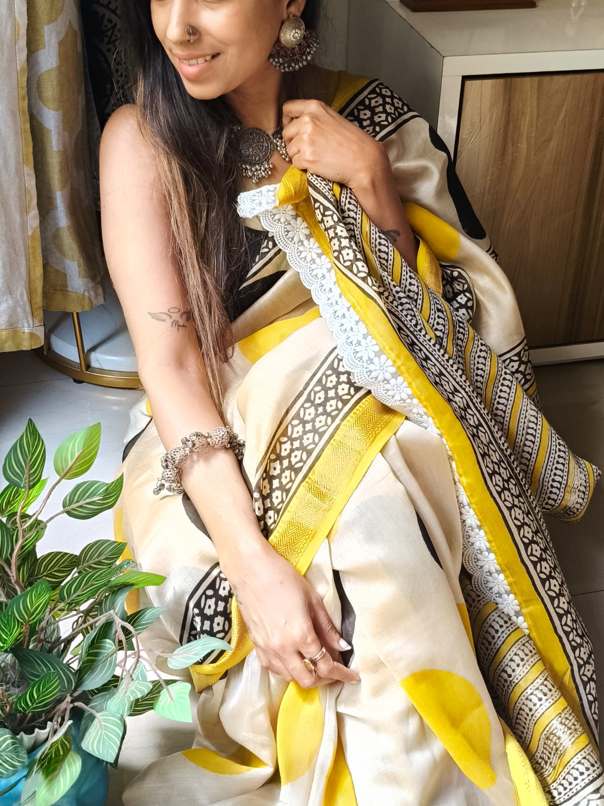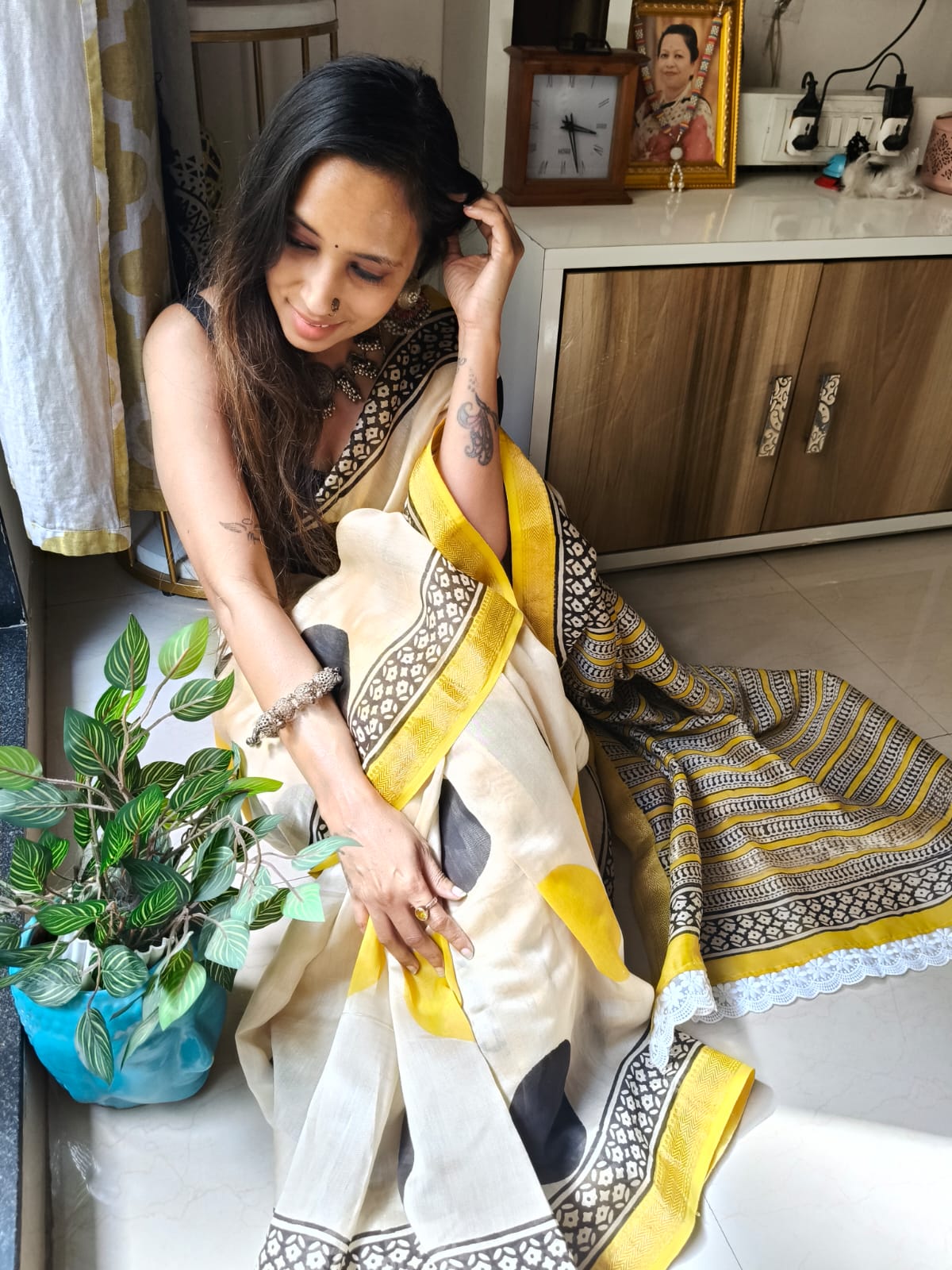 An Ajrakh Polka Dot Handblock Maheshwari Silk Saree with Additional Blouse Fabric