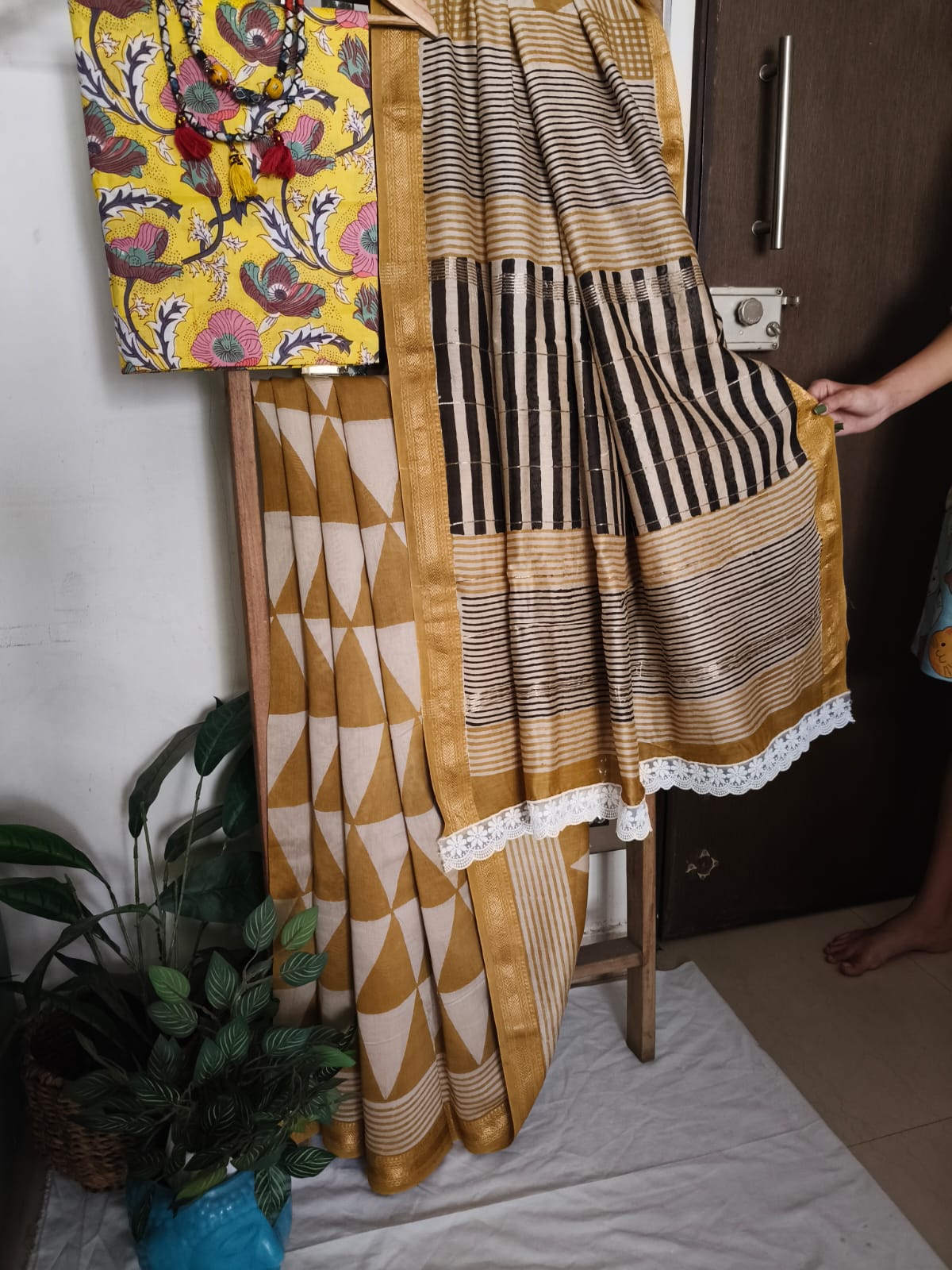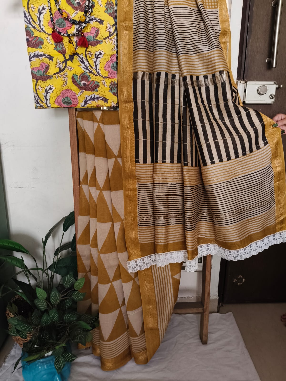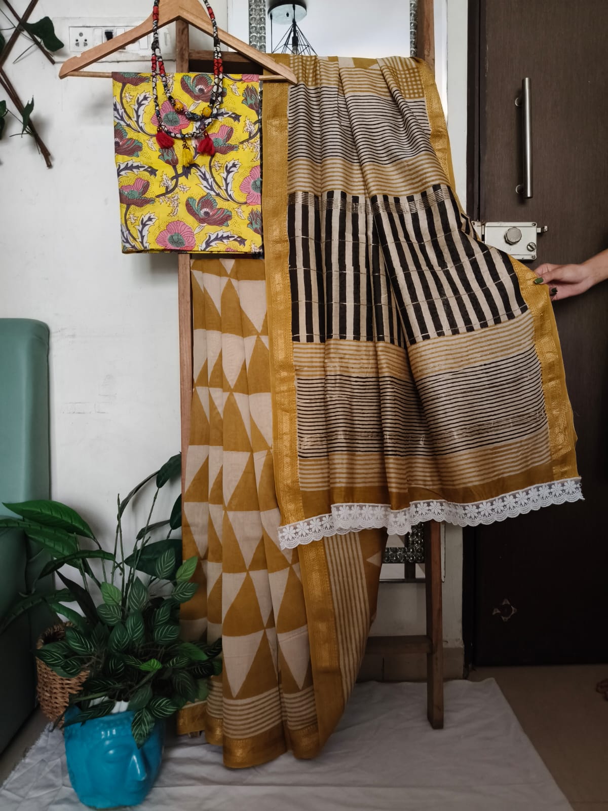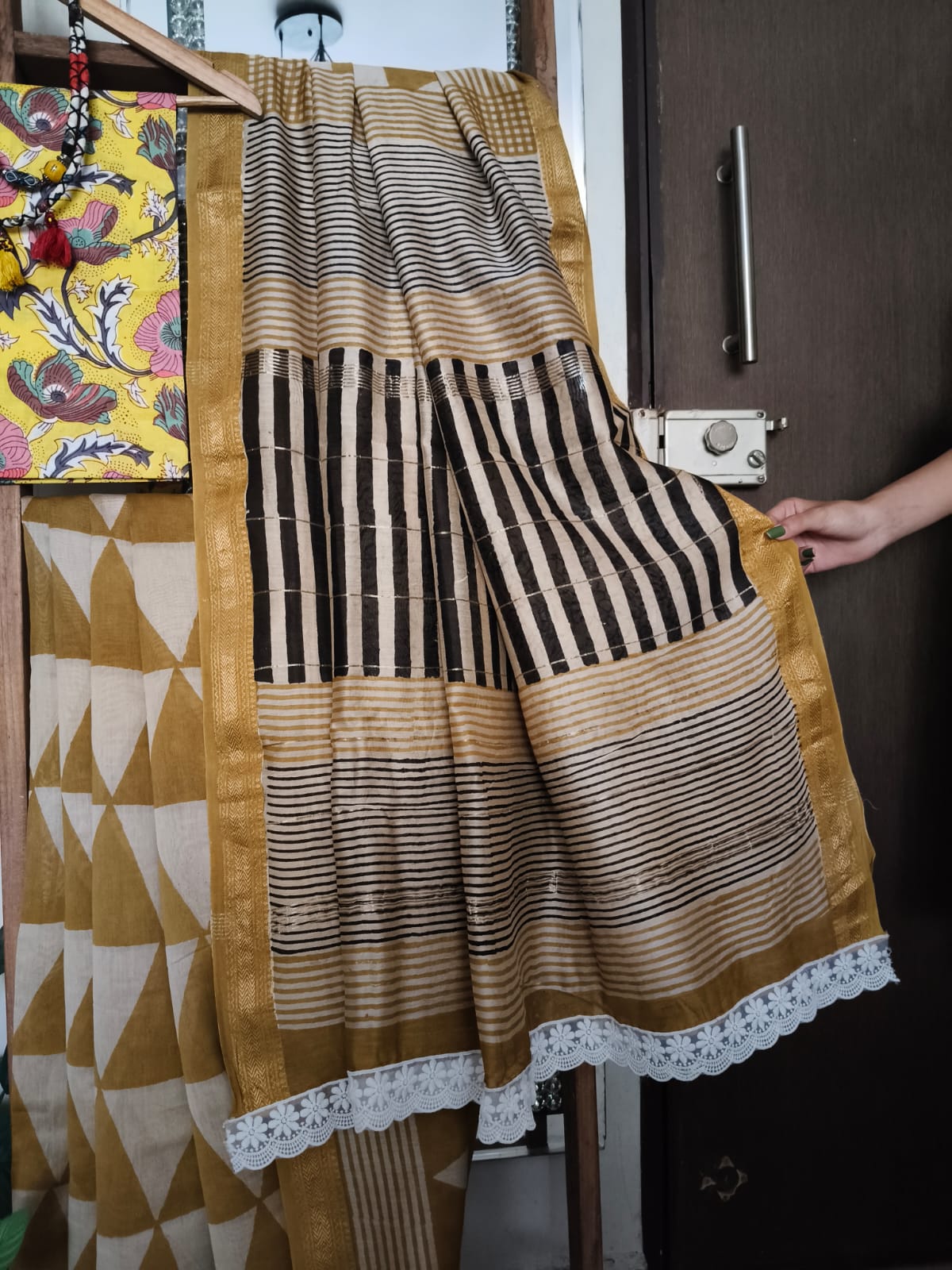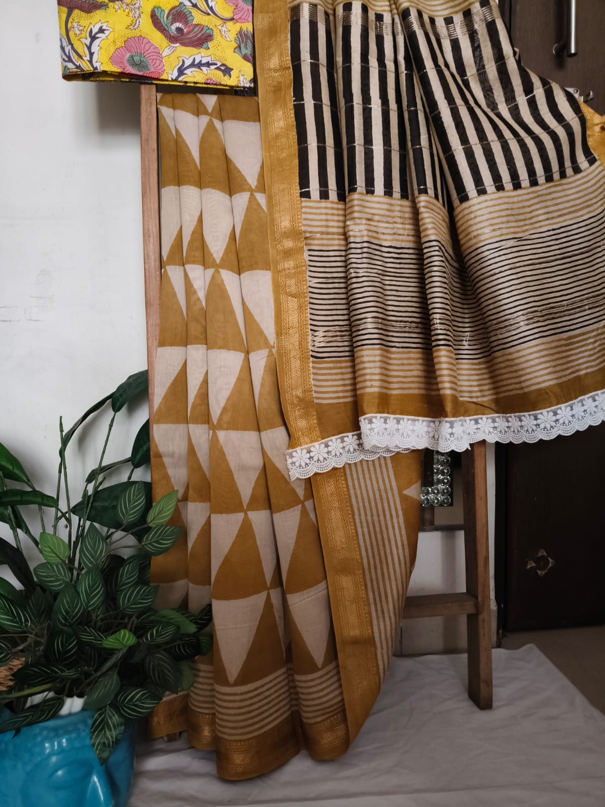 A Yellow Geometric Handblock Maheshwari Silk Saree with Additional Blouse Fabric