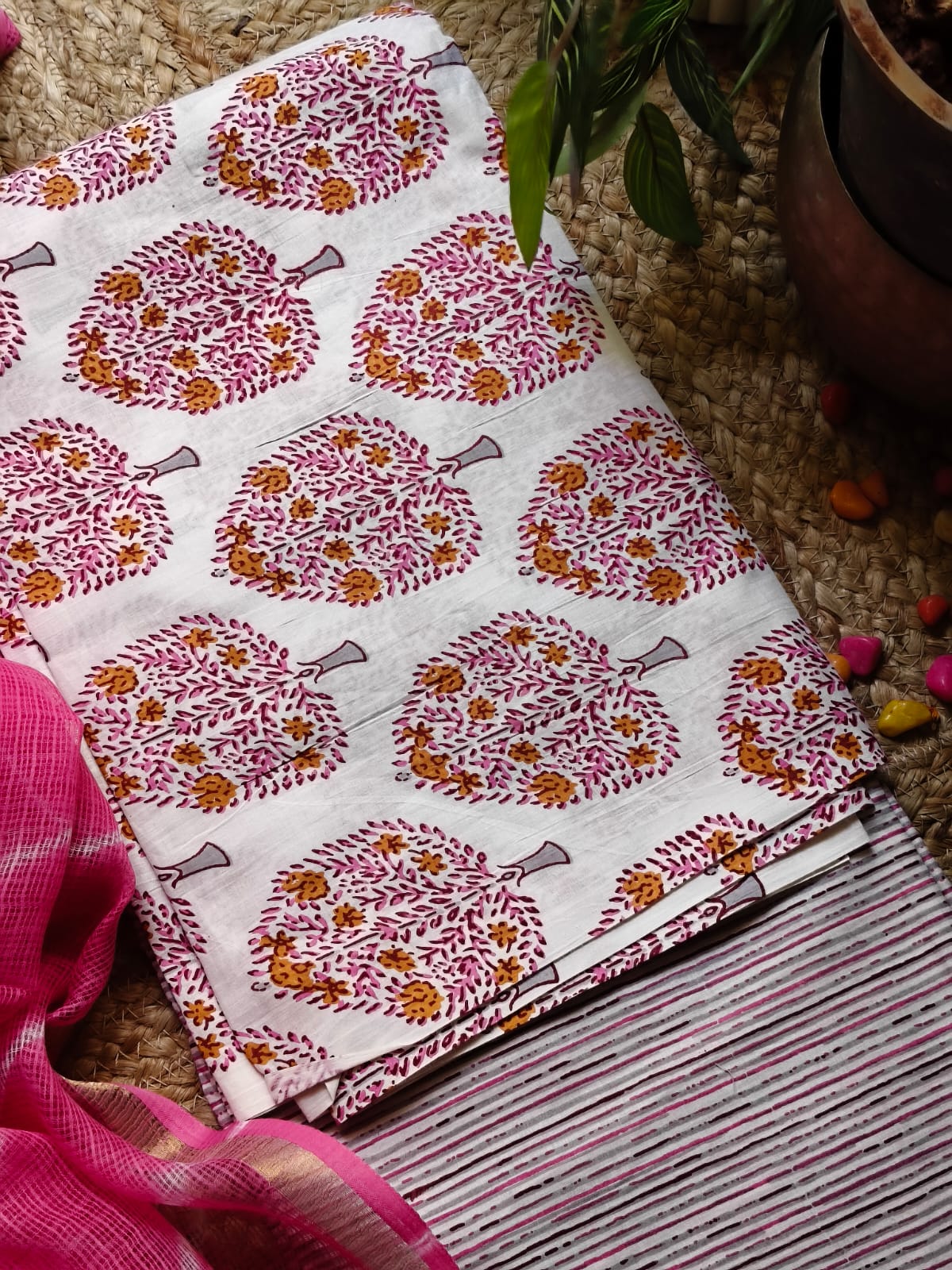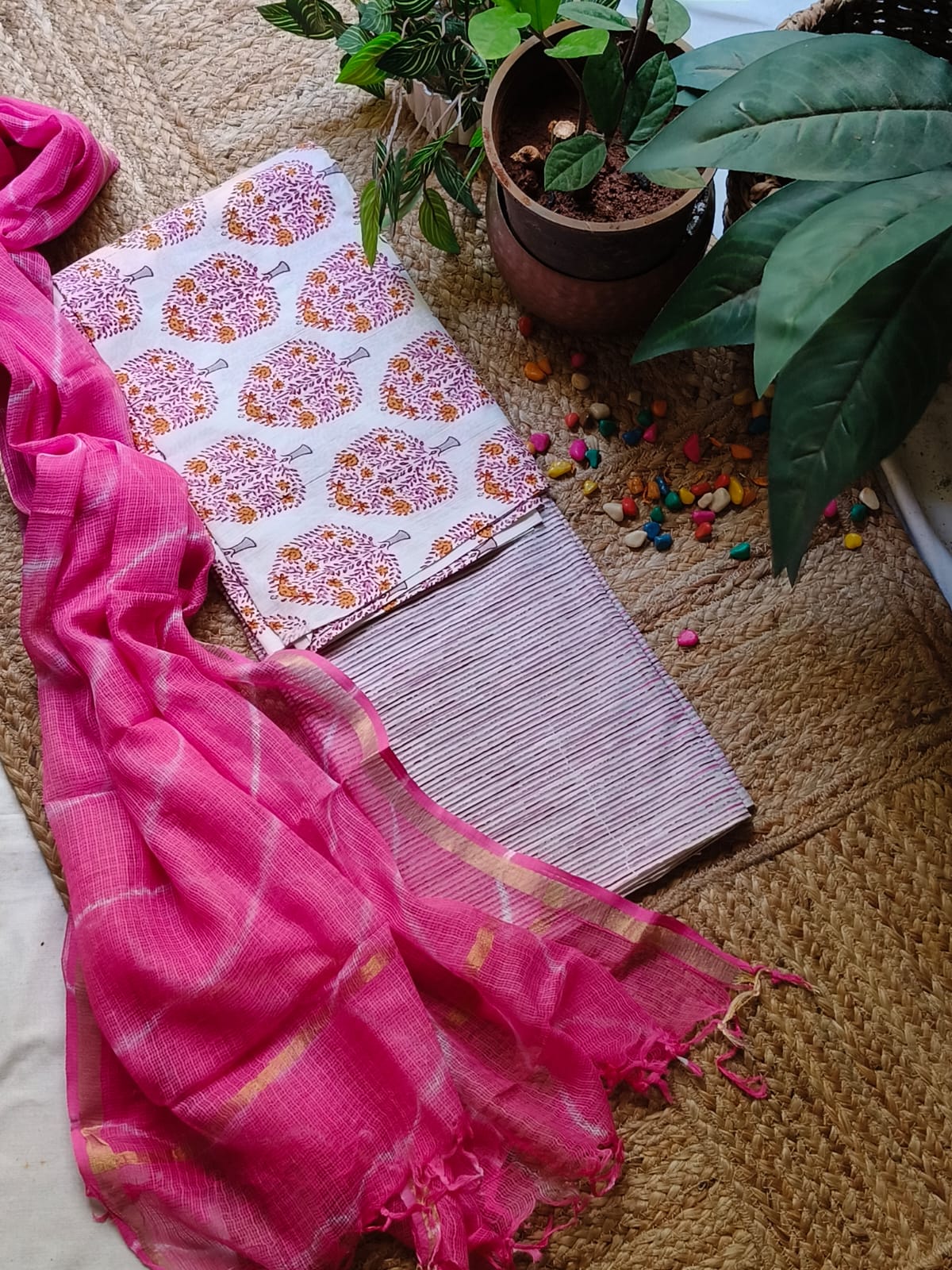White And Pink Sangeneri Cotton Suit Set With Kota Dupatta